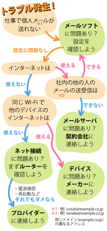 そんなとき、デルターで心掛けていることは「落ち着く」「問題を区分けする」の2点です。いろいろなトラブルがあるのですべては紹介できませんが、今回は「急にメールが送れなくなった」というケースを例にご紹介します。
